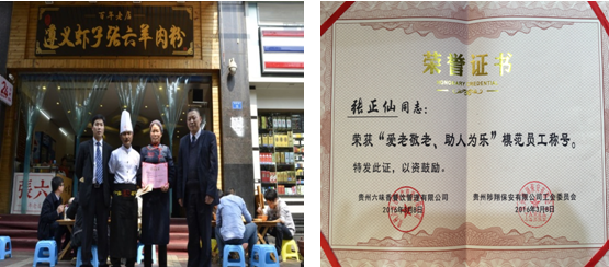 2016年3月6日晚,遵義蝦子張六羊肉粉普陀路店出現(xiàn)了溫馨的一幕:粉店員工張正仙與一位吃粉的老人并不認(rèn)識(shí),當(dāng)時(shí)老人與一名老阿姨一起來(lái)到粉店,進(jìn)來(lái)時(shí)張大姐就注意到老人走路不太方便。粉端上桌后,與老人一起來(lái)的老阿姨就離開(kāi)了,老人用右手顫顫巍巍地夾起粉朝嘴里送,很是費(fèi)勁,張大姐看著有點(diǎn)不忍,就走上前去問(wèn)老人是否需要幫忙。在征得老人同意后,她像照顧自家的老人一樣,站在老人面前,左手端著羊肉粉,耐心地喂老人,擔(dān)心熱湯熱粉燙到老人,張大姐一邊吹冷一邊喂,慢慢的將粉喂完后,才繼續(xù)忙自己的工作。