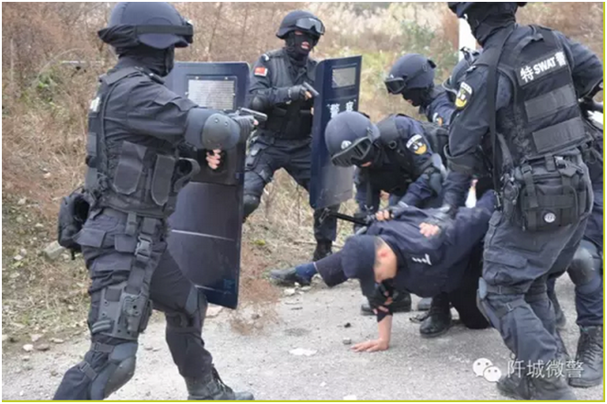 在演練現(xiàn)場,2名喬裝成警察的“歹徒”在通往一鄉(xiāng)鎮(zhèn)的公路上設(shè)卡,借口例行檢查,持槍對(duì)一輛有“鎮(zhèn)東護(hù)運(yùn)”字樣的運(yùn)鈔車實(shí)施“搶劫”,在與押運(yùn)人員交談中,不料卻被押運(yùn)人員識(shí)破其“詭計(jì)”,2名“歹徒”原形畢露,立即開槍射擊,就在這一瞬間,押運(yùn)人員依法開槍將其中一名“歹徒”“擊傷”并迅速駕車至安全區(qū)域。同時(shí),電話向警方報(bào)警求助。隨后,警方快速集結(jié)特警、巡警等30余名警力前往處置,通過喊話和政策攻心,2名“歹徒”仍然負(fù)隅頑抗,并向特警開槍。在勸說無效的情況下,指揮員下達(dá)對(duì)持槍“歹徒”采取強(qiáng)制措施的命令。歷時(shí)8分鐘,特警成功將2名“歹徒”制服并抓獲,隨即在醫(yī)護(hù)人員的幫助下,將“受傷”“歹徒”抬上救護(hù)車,送往醫(yī)院……