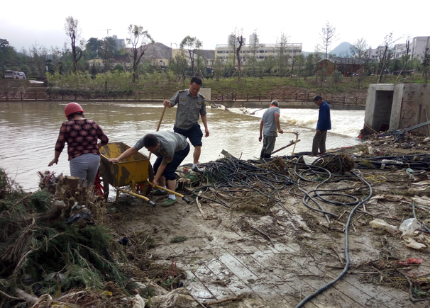 同時(shí),洪水還導(dǎo)致了沿河兩岸絕大部分的沿江步道被淹,綠化、亮化、沿線亭閣、景觀、護(hù)欄均被嚴(yán)重沖毀,河岸邊步道上留下了大量白色垃圾和淤泥。為了使災(zāi)后堆積的垃圾能夠盡快得到清理,小分隊(duì)與環(huán)衛(wèi)工人一起出動清淤的同時(shí)還將被洪水沖毀的護(hù)欄邊的垃圾也一同清理干凈。