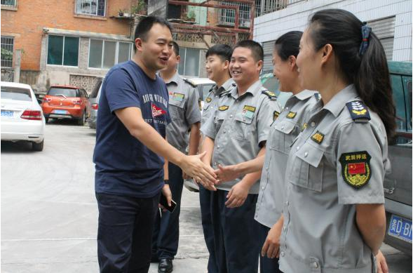 9月3日,銅仁本部總經(jīng)理陳葉率領(lǐng)行政人員一行人對(duì)城區(qū)各中隊(duì)進(jìn)行了節(jié)日期間值班情況的檢查,看望、慰問一線員工,并和員工一起觀看大閱兵。