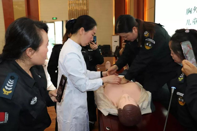 首先由新舟鎮(zhèn)衛(wèi)生院護士長一行人員為參訓保安員講解急救要領,現(xiàn)場演示徒手心肺復蘇操作技巧,并要求每位保安員實操練習。